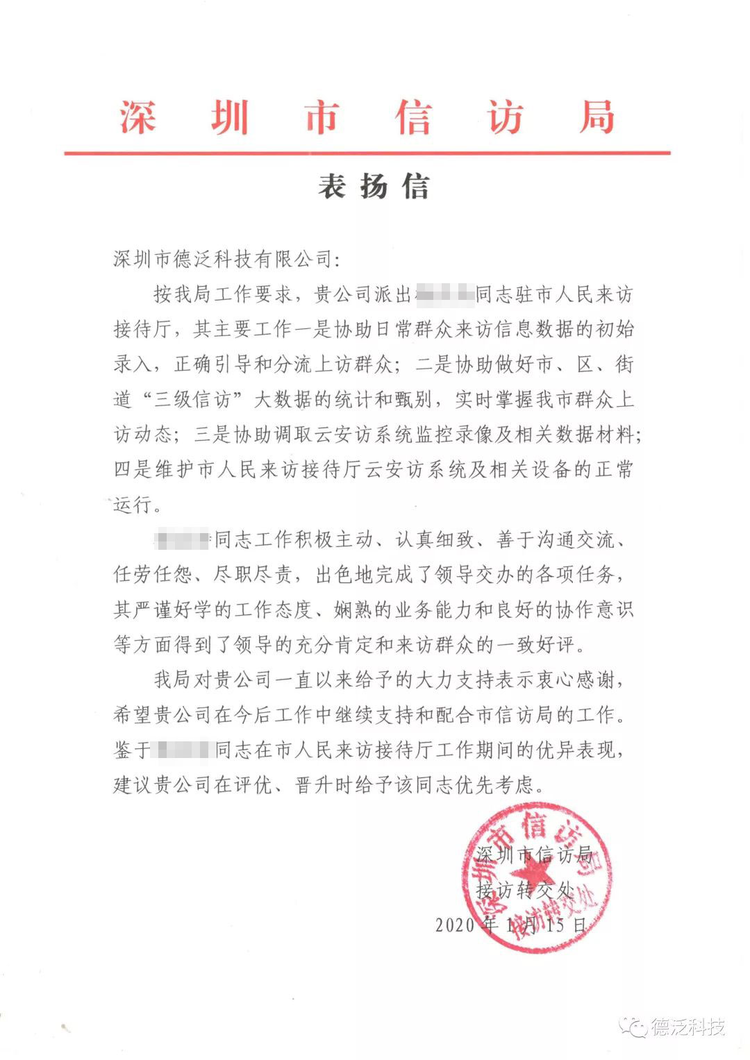 近期,德泛科技陸續(xù)收到了來自深圳市信訪局、深圳市退役軍人事務(wù)局等職能部門的表揚信(感謝函)。深圳市信訪局的表揚信講到:“德泛科技在云安訪信息平臺項目中出色的完成了領(lǐng)導(dǎo)交辦的各項任務(wù),得到了領(lǐng)導(dǎo)的充分肯定與來訪群眾的一致好評?!?/p>